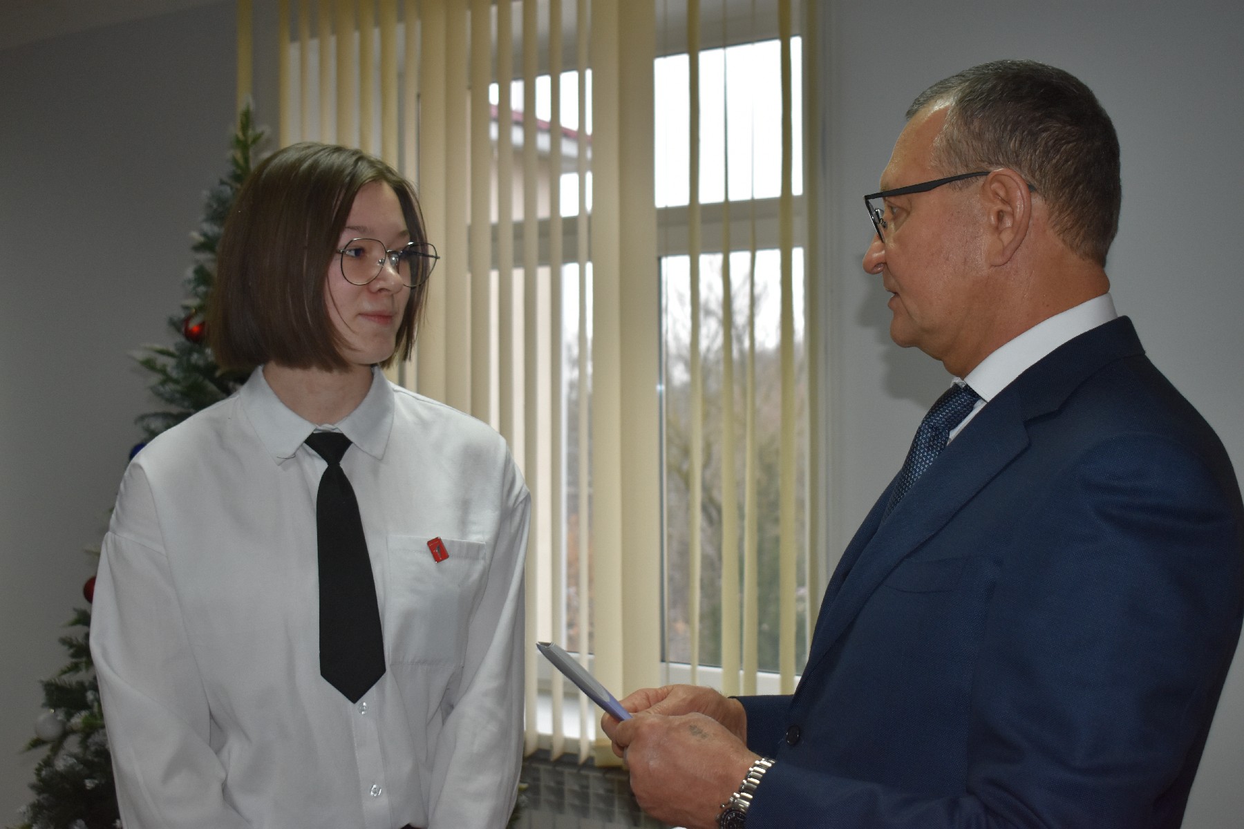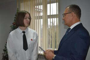 Главный документ, удостоверяющий личность человека, из рук главы района Владимира Оводкова и сладкий новогодний подарок получили ученица 7 класса Нижнеякимецкой школы Ульяна Ерохина и ученица 8 класса Благовской школы Анастасия Херуимова.