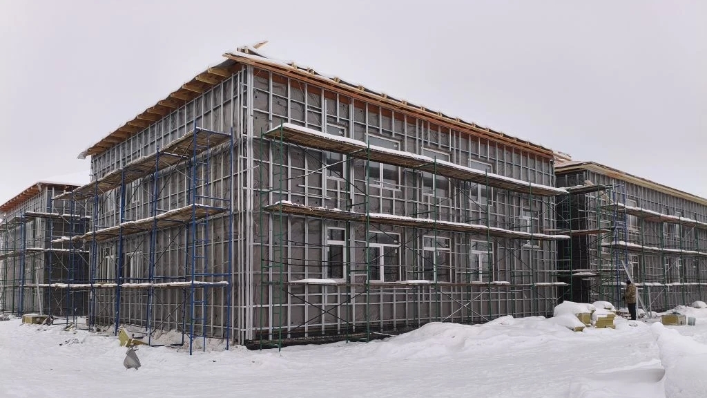 Строители возвели фундамент и стены двухэтажного здания. Установили окна. Полностью смонтировали блочно-модульную котельную. Подвели все коммуникации. В настоящее время выполняют кровельные и фасадные работы.